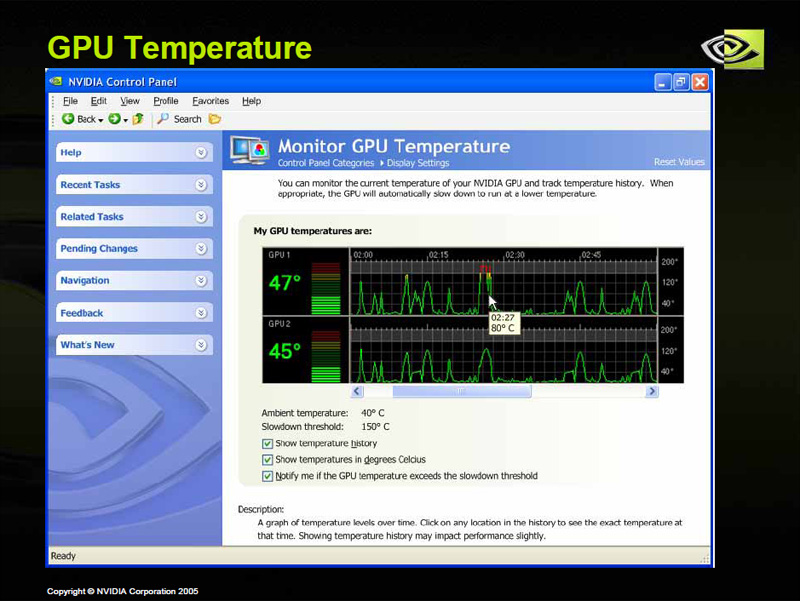 | Release 80で実装される予定の新UIについて言及したスライド(出展:NVIDIA)。一つ一つ拡大して見てほしいが,「エクスプローラ」ライク,かつ"見ため"重視であることが窺える。オーバークロック機能は標準搭載か? また,SLI動作時には2個のグラフィックスチップについて,温度を同時にチェックできるようになるようだ | ||