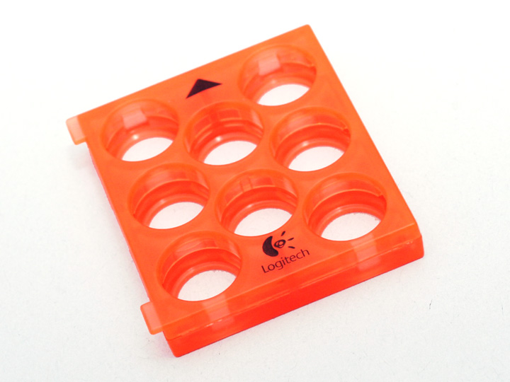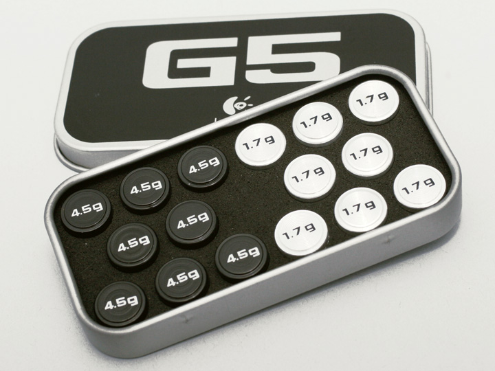 おそらく,ロジクールがG5の目玉機能として考えているギミックが,マウスの重量を好みで調整できる「ウェイトカートリッジ」だ。これはその名のとおり,マウスの底面に挿入して利用するカートリッジ。4.5g×8個,1.7g×8個の錘(おもり)から好きな重さを最大8個選択してはめ込んでG5へ挿入することで,G5の重さも,重さのバランスもユーザーの好みのままに調整できる。マウス底面には「ポリテトラフルオロエチレン」という素材のソールが3か所に取り付けられているのだが,このソールによって従来製品よりも滑りやすくなっているマウスを,錘(おもり)で制御しようというわけである。