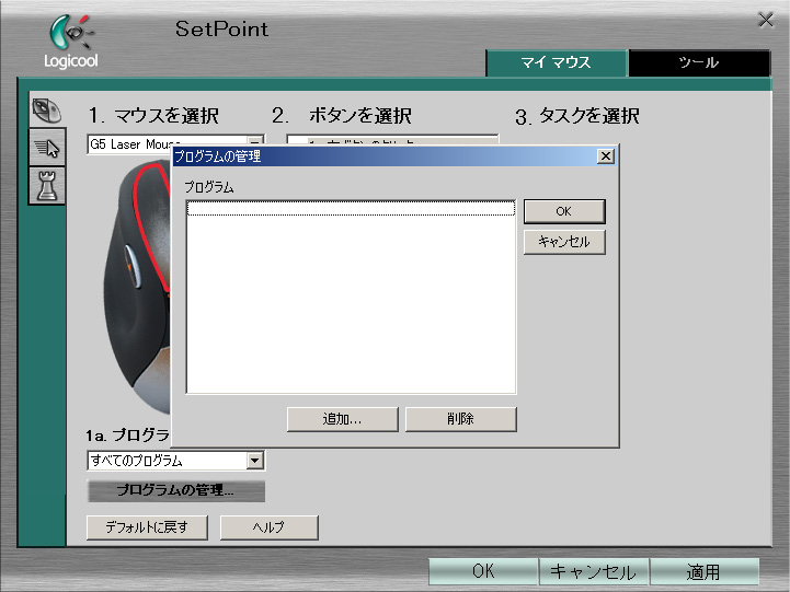 | SetPointのコントロールパネル。基本的なボタンバインドはここで行えるが,左下のプログラムの管理ボタンを押すと,詳細設定が可能になる |