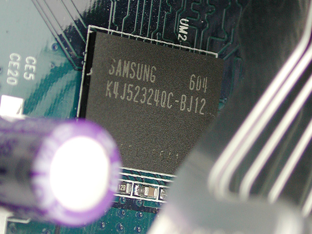 K4J52324QC-BJ12がサポートする最高クロックは800MHz。データレートは1.6Gbps(クロック換算で1.6GHz相当)なので,マージンとしては100MHz(200MHz相当)ある計算だ。もっといえば,1.2ns品なので,理論上の最高クロックは833MHz(1.66GHz相当)。このあたりのスペックが,「クロックアップバージョンで,しかもオーバークロックマージンがある」とされる理由の一つだろう。