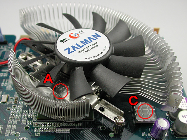 さらに,今回はテスト用システムを,Cooler Master製のスチール製ミドルタワーケース「Centurion 530」へ組み込んで,GF 7600GS-ZとGF 7600GS-Z(OC)について,カード各所の温度を計測してみることにした。横河M&Cのデジタル放射温度計「53005」を用いて,以下に挙げるA/B/Cの場所を計測している。なお,計測に当たっては,サイドパネルを閉じておき,直前に開ける,という手段を採用している。