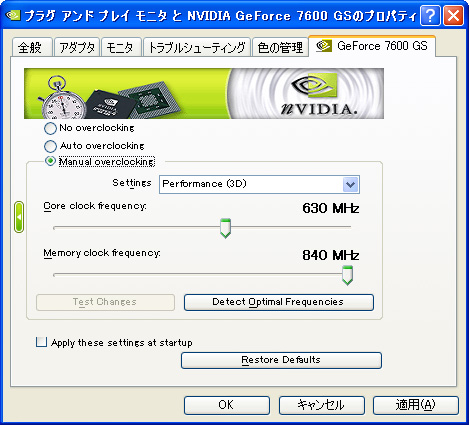 | GF 7600GS-Zで動作クロックの変更を試みたところ。840MHzというのは,ForceWareの設定上限だったりする |