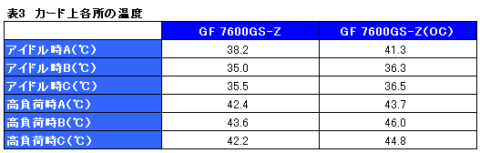 その結果は表3にまとめた。オーバークロック動作させると,カード上各所の発熱が懸念されるが,A/B/Cのどの部分でも,劇的な温度上昇は見られない。せいぜい3℃であり,この冷却能力が大きなオーバークロックマージンを生んでいるようだ。