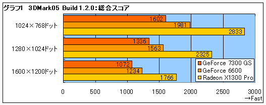 順に見ていこう。まずグラフ1は「3DMark05 Build 1.2.0」の総合スコアだが,GeForce 7300 GSは,GeForce 6600の8割程度のスコアしか得られていない。グラフィックスドライバレベルでの最適化が進んでいる同ベンチマークテストにおいて,NVIDIAとATI Technologies両社のグラフィックスチップを直接比較することにあまり意味はないが,それを割り引いても,Radeon X1300 Proとの差は歴然だ。同じピクセルシェーダ数であることを考えると,GeForce 7300 GSのスコアは少々いただけない。
