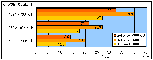 続いて「Quake 4」では,「The Longest Day」というマップで7名によるデスマッチを行ったリプレイを利用し,Timedemoから平均フレームレートを計測した。その結果がグラフ5なのだが,GeForce 7300 GSとGeForce 6600とでは,どの解像度においても大きな差が見られる。一方で,Quake 4において,GeForce 7300 GSがRadeon X1300 Proのスコアを上回ったことは評価していいと思われる。