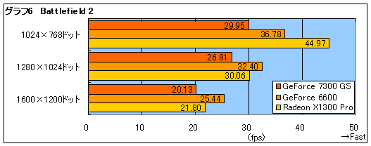 「Battlefield 2」では,「Dragon Valley」で実際に行われたコンクエスト(16人×16人対戦)のリプレイをスタートから120秒間再生し,「Fraps 2.60」で平均フレームレートを計測している。グラフ6がその結果だ。GeForce間の歴然たる差は,ここでも変わっていない。