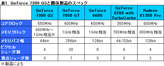 ピクセルシェーダ(Pixel Shader)が4基,頂点シェーダ(Vertex Shader)が3基というスペックは,GeForce 6シリーズのローエンドモデルだったGeForce 6200シリーズと同じ。メモリバスが64bitで,メインメモリの一部をフレームバッファとして利用する技術「TurboCache」に対応していることを考えても,メインストリーム向けとは言い難い。なお,リファレンスの動作クロックはコア550MHzで,グラフィックスメモリの動作クロックは製品ごとに異なるようだ。メモリチップはGDDR2/3の両方をサポートする。このほか,主な仕様は表1にまとめたので,参考にしてほしい。