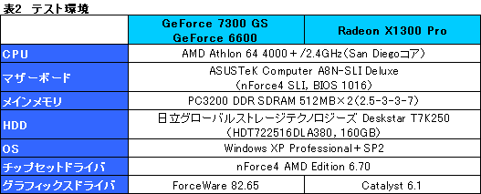 ローエンド向け製品とはいえ,GeForce 7の名を冠するだけに,パフォーマンスが気になる人はいると思う。そこで,表2のテスト環境において,ベンチマークテストを行ってみることにした。比較対照用として,Albatron Technology製のGeForce 6600カード「PC6600」(以下GeForce 6600)と,TulのRadeon X1300 Proカード「PowerColor X1300 PRO」(以下Radeon X1300 Pro)を用意している。