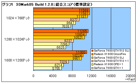 さて,3DMark05のスコアからだ。まず,総合スコアをグラフ1〜3にまとめた。