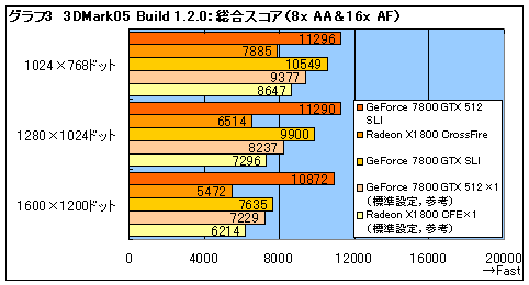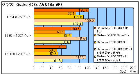 これに対して,グラフ8,9で描画負荷が高くなってくると,GeForce 7800 GTXのSLIやRadeon X1800 CrossFireに対して,GeForce 7800 GTX 512は明確なアドバンテージを見せつける。とくに8x AA&16x AFでは,1280×1024ドット時に,なんと50%以上高いスコアを叩き出しているのだ。