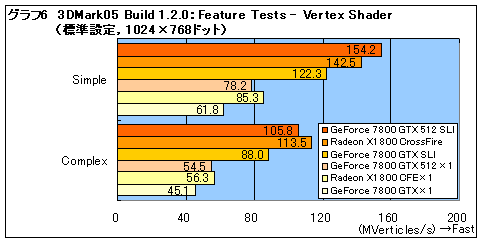 続いてFeature Testsの結果をグラフ4〜6にまとめてみた。意味がないことを承知で,あえてRadeon X1800 CrossFireと比較してみると,Radeonが圧倒的な強みを見せる頂点シェーダ(Vertex Shader)のテストにおいて,GeForce 7800 GTX 512のSLIが項目「Simple」で逆転している点が興味深い。