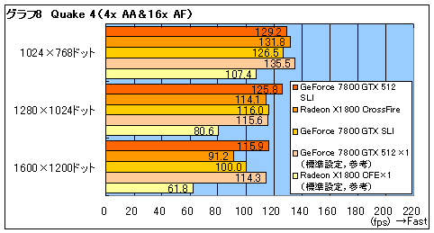 ここからは実ゲームタイトルにおける比較に入っていこう。まずはQuake 4だが(グラフ7〜9),ここでは標準設定とそれ以外で,傾向がまったく異なっている。標準設定では,GeForce 7800 GTX 512のSLIに,メリットはまるで見いだせない。それどころか,GeForce 7800 GTX 512のスコアにも負けているほどだ。