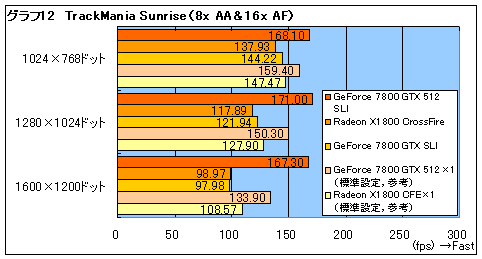 TrackMania Sunriseは,最近のハイエンドグラフィックスチップからすると「軽すぎる」部類に入るゲームなので,順当に行けば,負荷が軽くなるほどフレームレートは伸びるはず。それがないのは,テスト環境にある,Athlon 64 4000+/2.4GHzというCPUの処理能力が,限界を迎えたからと見て,まず間違いない。GeForce 7800 GTX SLIでも,標準設定における1024×768ドットと1280×1024ドットの間に差がないあたりから,その傾向は出ているが,GeForce 7800 GTX 512 SLIで完全に露呈したと見ていいだろう。