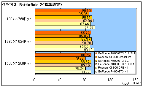 その一方で,SLI動作をさせると,GeForce 7800 GTXと差がなくなってくる。高レベルのエフェクトを適用し,さらに高解像度になってくると,だんだん地力の差が見えてくるが,描画負荷が低い状態では,ほとんど差がない。何か壁に当たっているかのような印象だ。