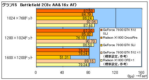8x AA&16x AFまでフィルタリングのレベルを上げ,さらに解像度を1280×1024ドット以上に設定すると差が出てくるのは,描画負荷が高まったからだ。とくに,GeForce 7800 GTXのスコアが大きく下がってくるが,Battlefield 2では描画負荷が高くなってくると,グラフィックスメモリ容量の差が効いてくる,と言い換えることもできるだろう。512MBのグラフィックスメモリ容量を搭載するGeForce 7800 GTX 512 SLIとRadeon X1800 CrossFireがほぼ同じスコアになっているところからもこれは裏付けられる。