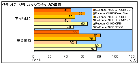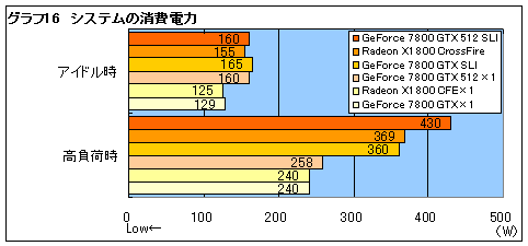 まず消費電力だが,システムベースとはいえ,GeForce 7800 GTX 512 SLIが高負荷時に430Wを記録した点は,特筆しておきたい(グラフ16)。GeForce 7800 GTXのSLIに比べ60Wも消費電力が高いGeForce 7800 GTX 512 SLIが“地球に優しくない”ソリューションなのは間違いないところだ。