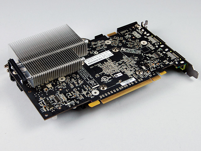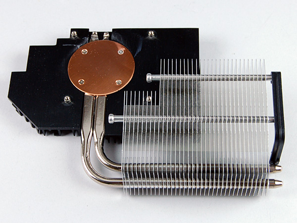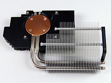 | GPUコアに触れる銅プレートから,2本のヒートパイプでカード背面の放熱フィンへ送り,フィンに溜まった熱はケース内のエアフローを頼りに冷却する仕様である。フィンがカードの“後方”で外に張り出す仕様なのは,Albatron Technology製のファンレスカードに似た印象も受けるが,関連は不明 |