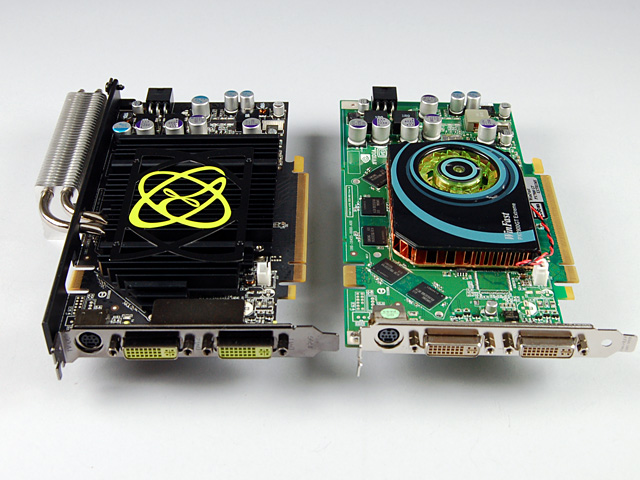 | Leadtek Research製のGeForce 7900 GT搭載カード(右)と比べてみた。カードデザインはGeForce 7900 GT/GSリファレンスカードとほとんど同じに見えるが,それだけに,XFX GeForce 7950 GT 570M Extremeが搭載するファンレスクーラーのせり出しが目を引く |