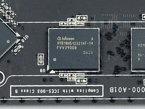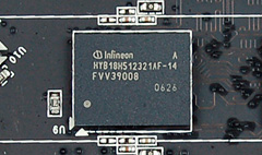 | 試用した個体では,Infineon Technologies(現Qimonda)製の512Mbit,1.4ns品「HYB18H512321AF-14」×8で容量512Mbitを実現していた。メモリクロックは1.46GHz相当なので,チップのスペックギリギリで動作する計算だ |