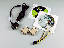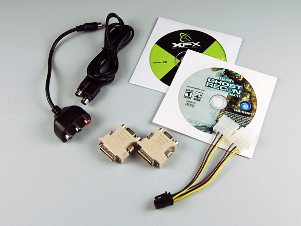 | 付属品一覧。DVI-I−RGB変換コネクタ×2はXFXのロゴ入り |
