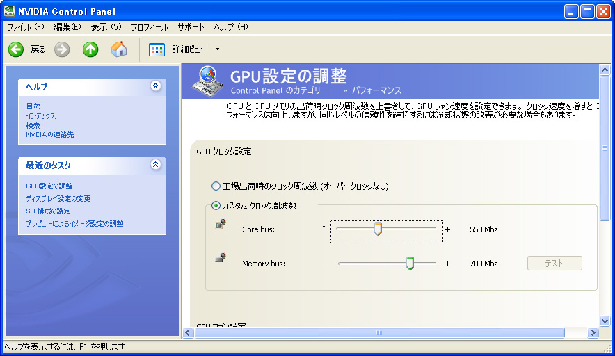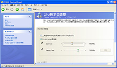 | CoolBitsフラグを立てて,NVIDIAコントロールパネルから動作クロックを変更可能にし,この状態からピクセルシェーダユニット(≒GPUコア)のクロックを550MHz,メモリクロックを700MHz(1.4GHz相当)に設定。これをリファレンスクロック動作とした |