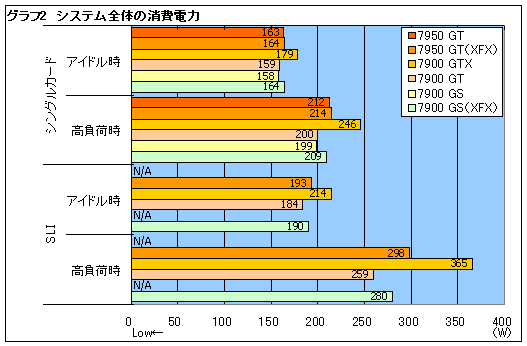 続いて,消費電力についても見てみよう( グラフ2)。グラフィックスメモリ容量で2倍,コアクロックで100MHzと,ともに大きな差がついているにもかかわらず,GeForce 7950 GTの消費電力が,GeForce 7900 GTとほとんど変わっていない点には注目したい。スペック的にはGeForce 7900 GTXに近づくGeForce 7950 GTだが,消費電力はそうではないようだ。断言はできないが,“G71-GT2コア”で,GeForce 7900シリーズの最適化は進んでいるのかもしれない。