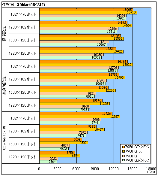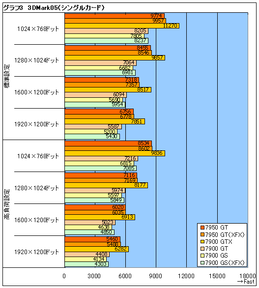 まずは,3DMark05で,全体的な傾向を見てみよう。シングルカード構成のテスト結果をグラフ3でチェックしてみるが,ものの見事に,GeForce 7900 GTXとGeForce 7900 GTの間に収まった。同時に,GeForce 7950 GT(XFX)に,オーバークロックのメリットがそれほどないことも,グラフからは判断できる。