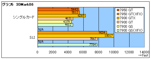次に,「3DMark06 Build 1.0.2」のBasic Editionで計測できる設定,1280×1024ドットのスコアをグラフ5に示した。こちらも3DMark05と同様の傾向を示しているのが分かる。