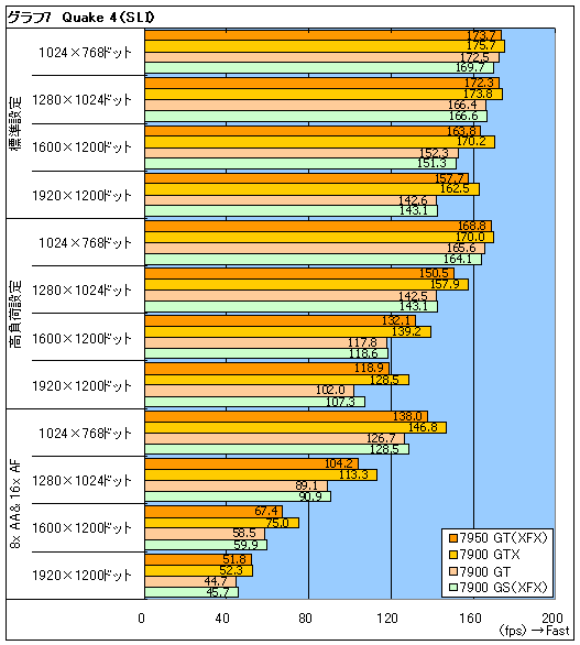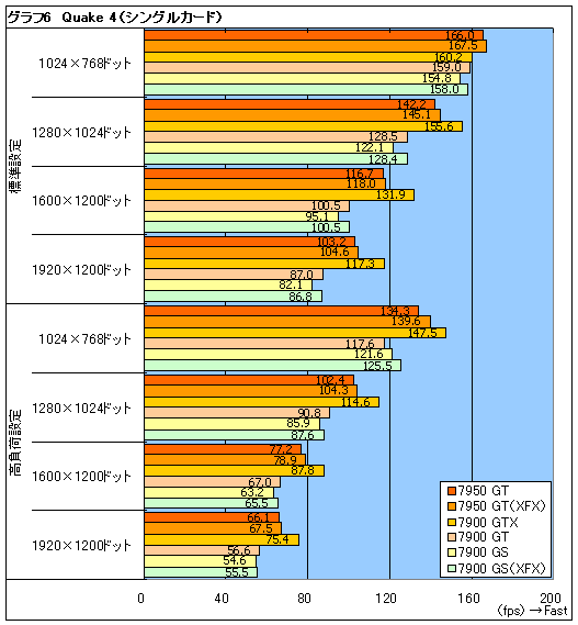 「Quake 4」(Version 1.2)において,シングルカード構成でテストを行った結果をまとめたのがグラフ6である。標準設定の解像度1024×768ドットで,なぜかGeForce 7950 GTのスコアがGeForce 7900 GTXを上回るというおかしな事態になっているものの,ほかの負荷設定や解像度設定では,全体的に3DMark05と似た傾向を示しているといえる。