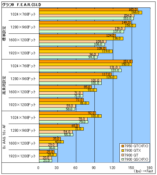「F.E.A.R.」(Version 1.05)のシングルカード構成では,動作クロック分,GeForce 7900 GTXから確実に差を付けられている印象だ(グラフ8)。もっとも,GeForce 7900 GTに対しては十分なアドバンテージがある。とくに,“あの”重いF.E.A.R.で,高負荷設定時にも,FPSを常時快適にプレイできるかどうかの一つの基準となる平均90fps近いスコアを叩き出しているのは,大いに評価していいだろう。ただし,オーバークロックの効果はほとんどなく,GeForce 7950 GTとGeForce 7950 GT(XFX)の間に,最大でも2fpsしか差がない点は,同時に指摘しておきたい。