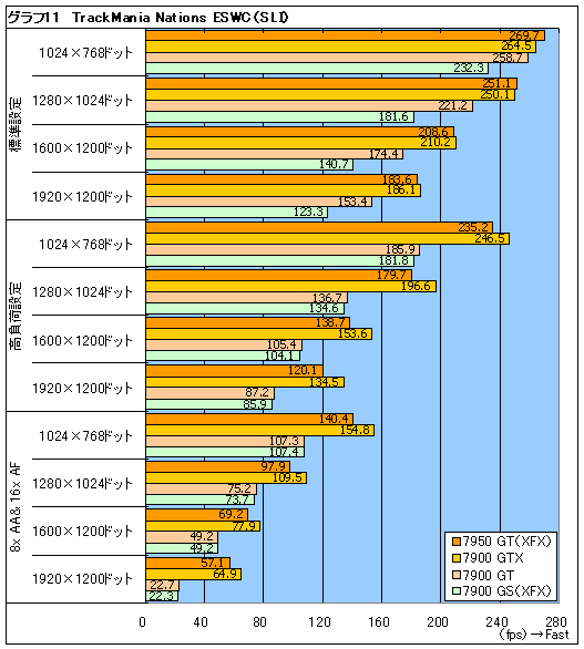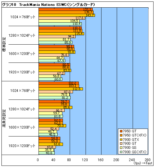 まずはシングルカード構成の結果をグラフ10にまとめてみた。平均60fpsを超えれば合格点といえるレースゲームにおいて,GeForce 7950 GTとGeForce 7900 GTXの間に,体感レベルの差はほとんどないと思われる。