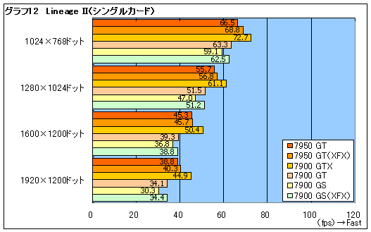 まずはシングルカード構成から見てみるが(グラフ12),GeForce 7900 GSのレビュー時にも指摘したとおり,GeForce 7900シリーズからすると,Lineage IIは“軽すぎる”タイトルだ。世のMMORPGで,Lineage IIより描画負荷の高いものはほとんどないことを考えるに,このクラスであれば,グラフィックスカードの細かな性能の違いが体感を左右することはほとんどないと思われる。