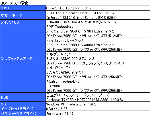 以後,とくに断りのない限り,カードの製品名ではなくGPU名で表記を行い,グラフ中は「GeForce」の表記を省略する。GPUのリファレンスからするとオーバークロックに当たるXFX製カード2枚については,NVIDIAのリファレンスクロック動作時を「GeForce 7950 GT」「GeForce 7900 GS」,XFXの保証する“定格クロック”動作時(=GPUのスペックからするとオーバークロック動作時)を「GeForce 7950 GT(XFX)」「GeForce 7900 GS(XFX)」と表記する。