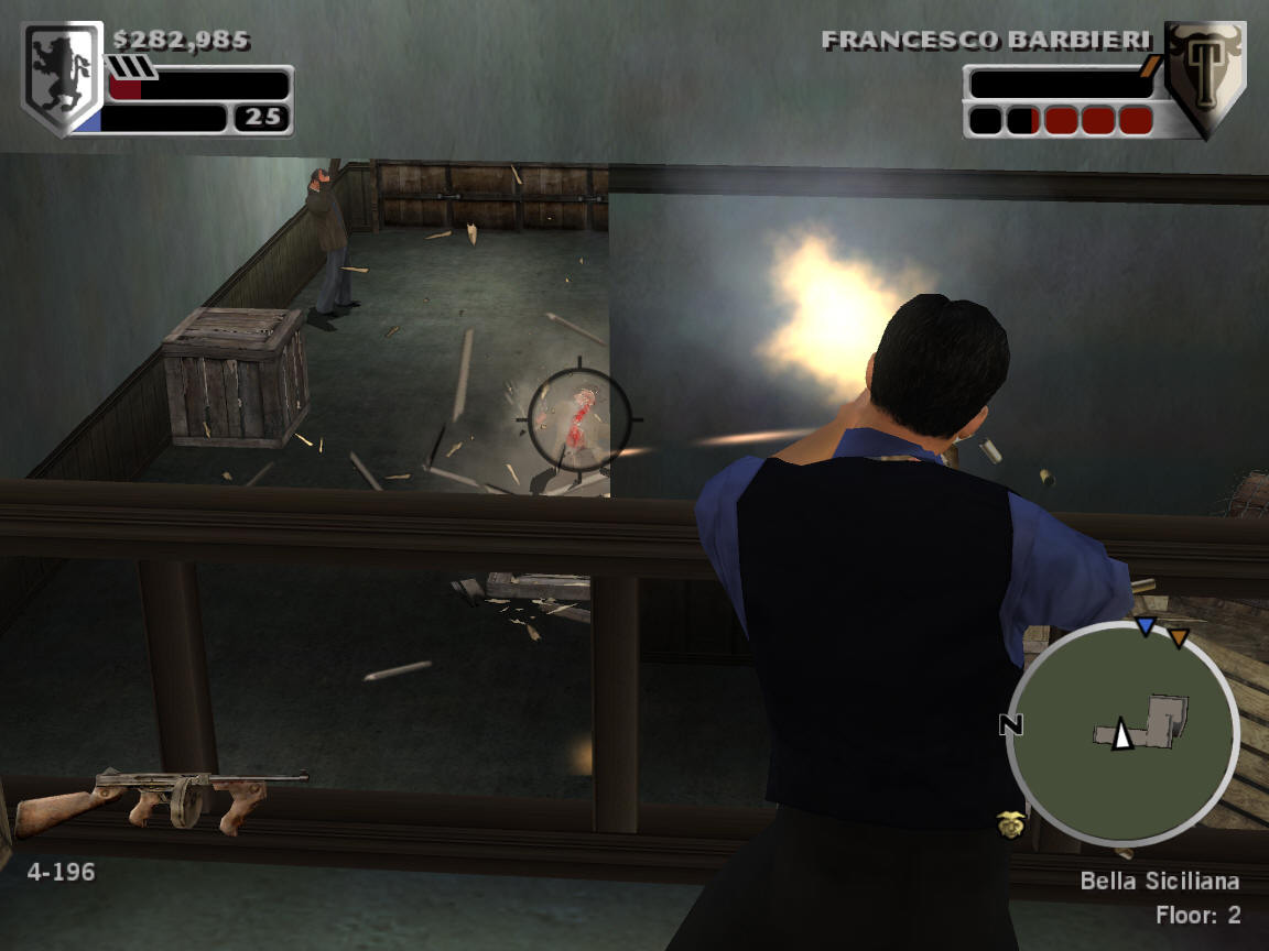| The Godfatherでは,拳を使ったファイティングと銃撃戦の二つで戦う。武器/人数の多い敵の隠れ家や倉庫の襲撃では,どのように攻めるかも重要な要素の一つとなる |