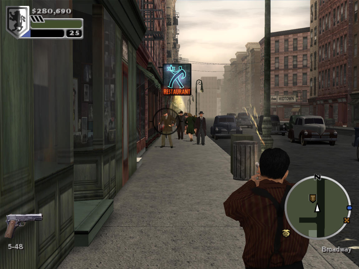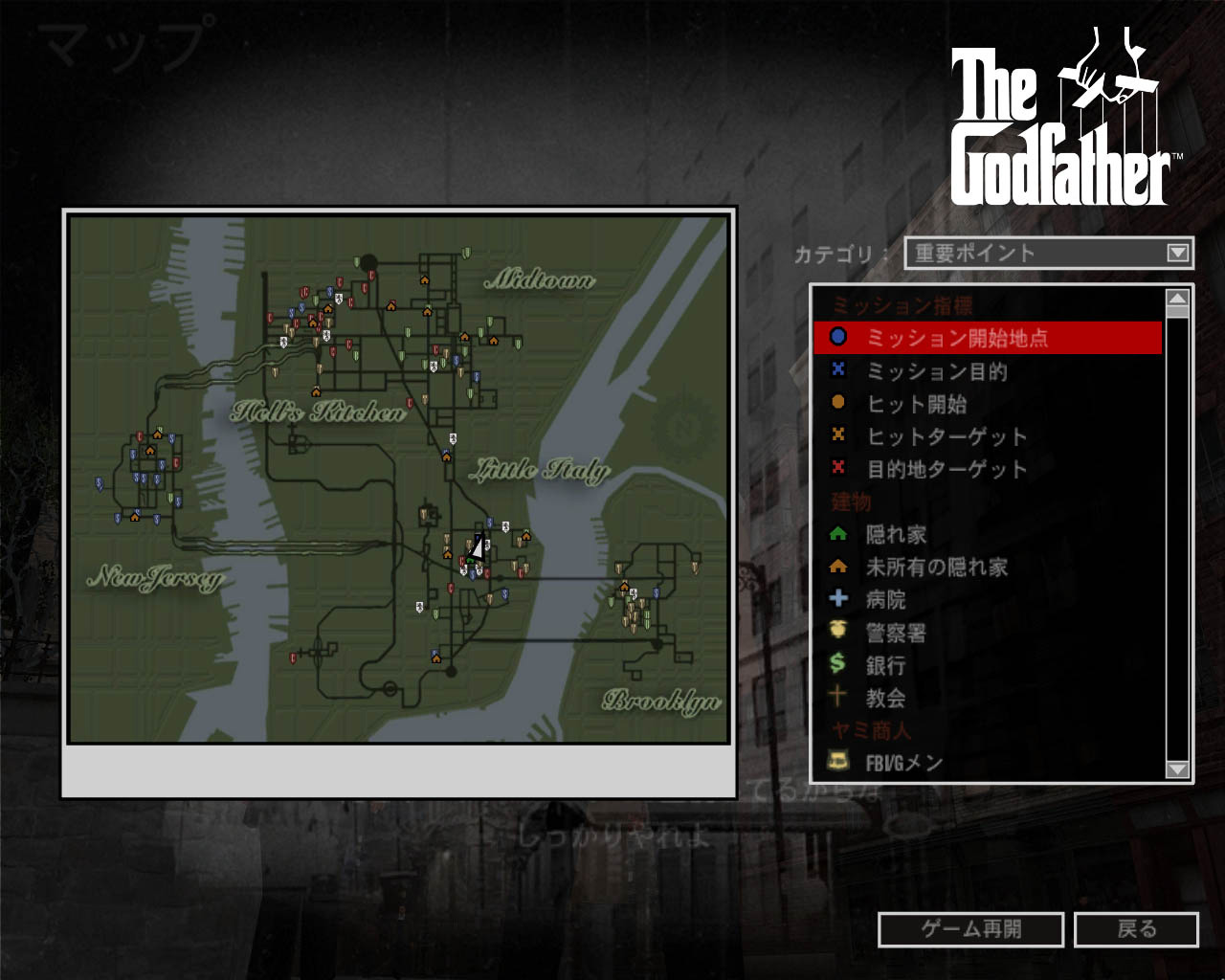 さて,The Godfatherでは,コルレオーネ一家に雇われたばかりの新人としてゲームを開始する。ゲーム内には,1945年から1950年代にかけてのニューヨークが細かく再現されており,コルレオーネファミリーの本拠地であるリトルイタリーから,ミッドタウン,ヘルズキッチンに至るマンハッタン島と,ハドソン川対岸のニュー・ジャージー,そして東のブルックリンという五つの地区が用意されている。