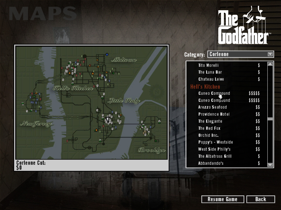 The Godfatherは,GTAのようなオープンデザインのマップになっていて,先に挙げたニューヨーク5地域の間を自由に往来できる。街には多くの人々が歩き,車が信号に従って行き交う,といった具合だ。5つの地域にはホテルや肉屋など,合計で100種類に及ぶビジネスがあり,これらをゆする(extortion)ことでコルレオーネ一家の庇護の下におき,週ごとの資金を得るのである。