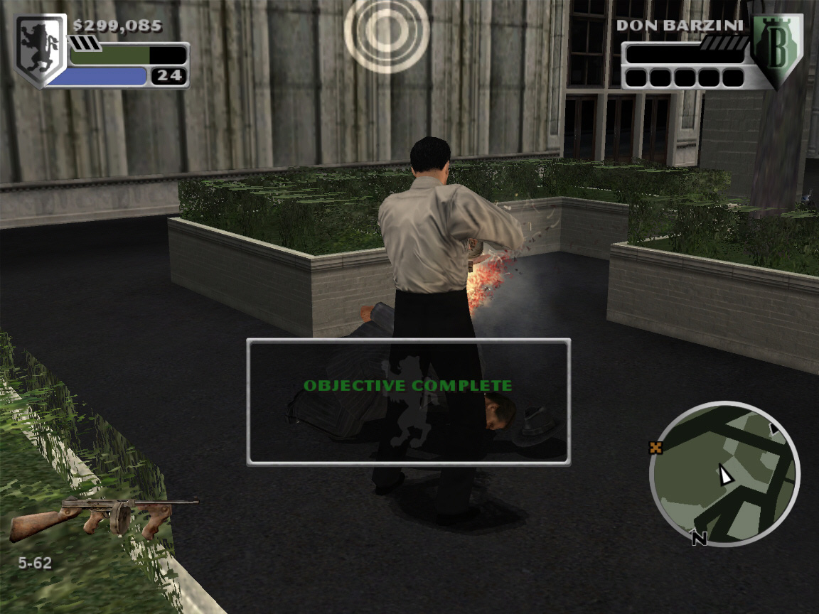 The Godfatherは,メインミッションだけなら15時間ほど,最終的にすべてのビジネスを傘下に収め“Don of NY (ニューヨークの首領)”と呼ばれるためには,50時間ほどの時間を要することになるだろう。とくに前半でプレイヤーがUnderbossに昇格する頃までは,ゲーム展開は映画のストーリーと複雑に絡み合っており,なかなか良くできている。暴れん坊ソニーやマイケルの片棒を担ぎ,ルカやクレメンザのミッションを請け負い,トム・ヘイゲンからは組織を大きくするための秘策を耳打ちされ,仕事がうまくいけばゴッドファーザーからの祝福を受ける……。