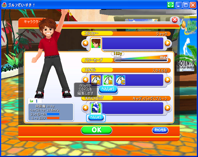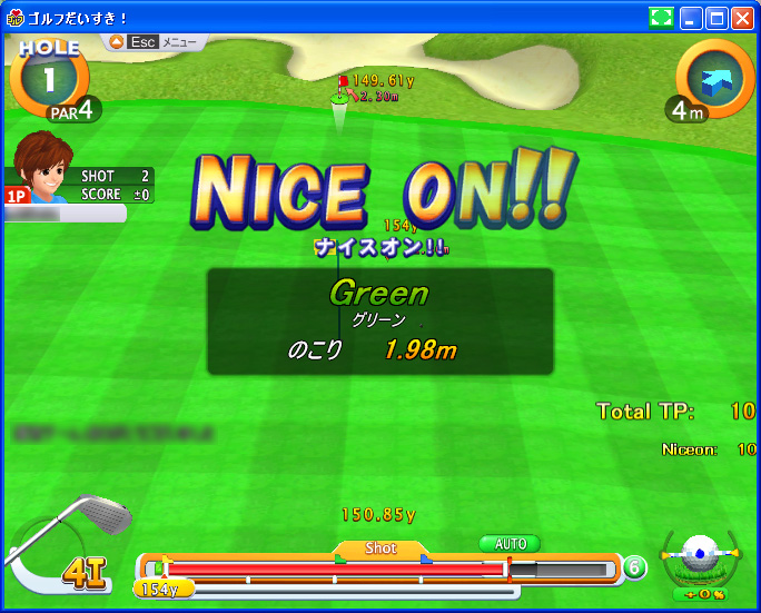 また,最大パワーがあらかじめ設定できるというのも特徴だろう。飛距離が約150ヤードの5番アイアンで,130ヤードのアプローチがしたい場合,従来のゴルフゲームではゲージの八分目あたりを狙って打っていたはずだ。本作ではあらかじめバーの長さ(つまりは最大パワー)を変更できるので,目分量による調整は必要ない。しかも「このパワーで打ったら130ヤードくらい飛びますよ」的なガイドまで表示される親切さ。この新機能をうまく使いこなせば,アプローチなどに威力を発揮するだろう。