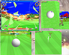 既存のゴルフゲームでは,コースを上空の視点から見たり,コース上でグリーンを確認したりするときは,視点切り替えの操作を行うというのが一般的である。しかし本作では,別々のウィンドウで複数の視点を常に見られるようにすることで,その手間を省いている。