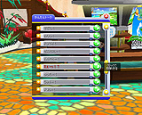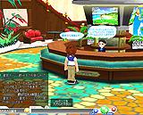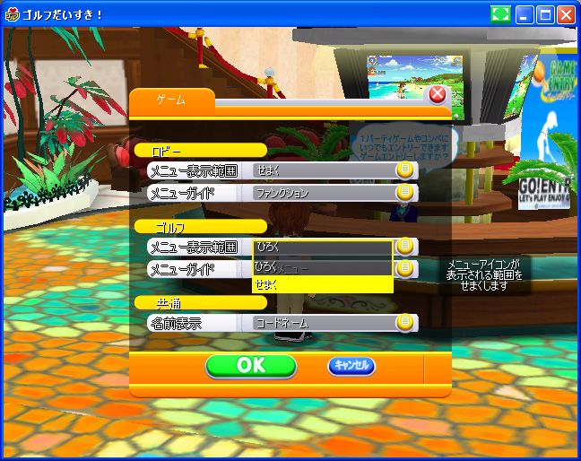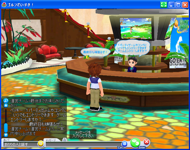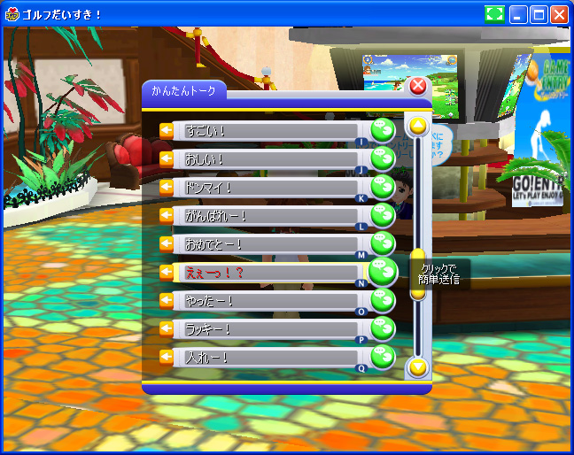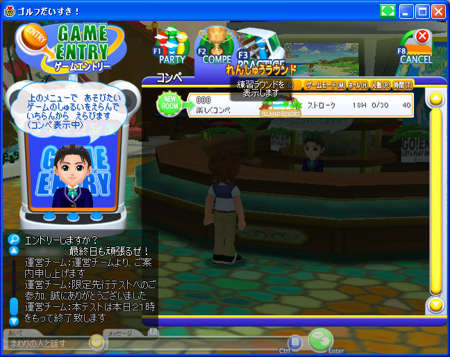 | 画面下に表示されている細いワクがチャット文字入力枠。テストでも問題なく機能していた | 挨拶や決めゼリフなどは,あらかじめマクロに登録されていた。もちろん編集機能も付いているので変更も可能だ | 今回のテストで遊べたアイランドリゾートは初心者向けコース。筆者のベストスコアはトータル54 |