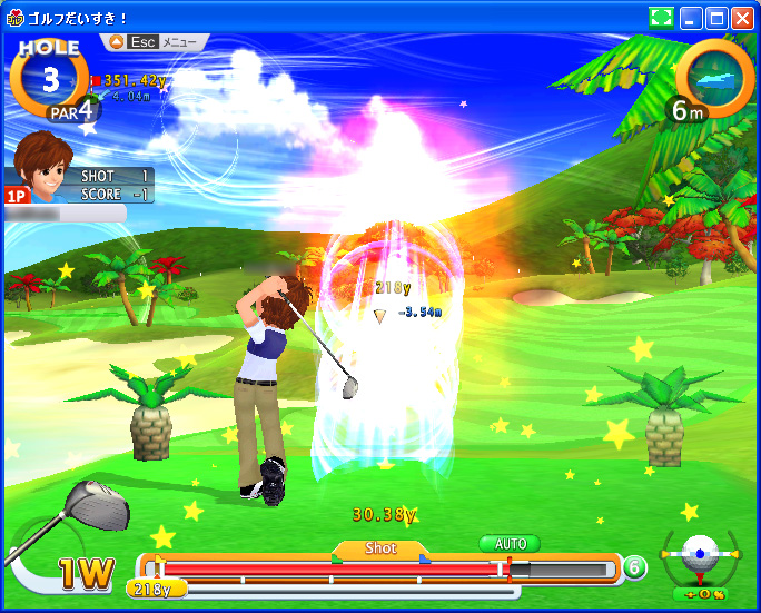 ショットの基本操作においては,スイング開始,パワー決定,インパクトタイミングの計3回ボタンを押すというのは,もはやゴルフゲームでは常識に近い。当然本作でも同様のシステムが採り入れられているのだが,それだけではなくインパクトでボタンを押すことを省略(ボタンを押すのはパワー決定までの2回だけ)した初心者向けの操作方法も用意されている。