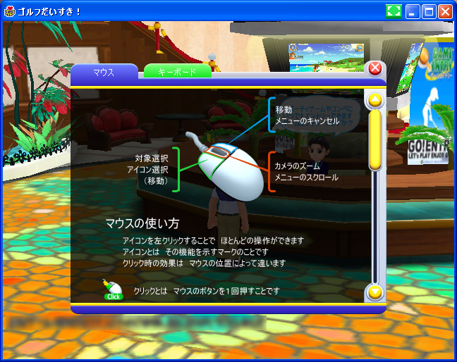 本作では,マウスのみでメニュー操作からショットに至るまですべての操作が行えるという点が特徴となっている(チャット時はさすがにキーボードを使用するが)。これはゴルフゲームでは珍しいことではないだろうか。