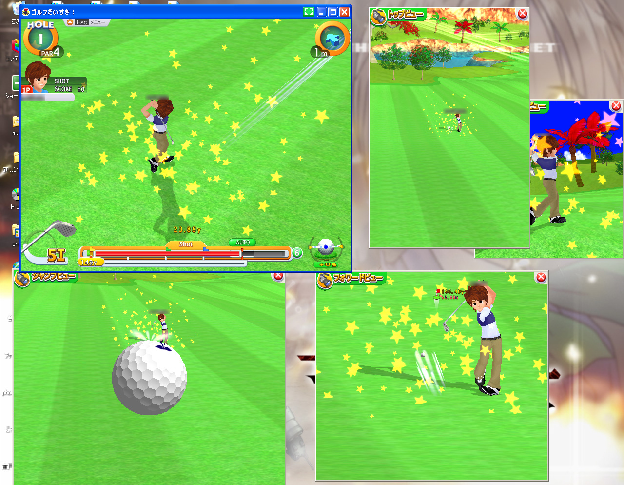 しかしゴルフだいすき!では,最大五つのウィンドウを同時に開き,さまざまなアングルからコースやショットを見られるようになっているのである。ウィンドウが五つ開いているとどうなるのか,ピンとこないかもしれないが,画面写真も使って説明していこう。