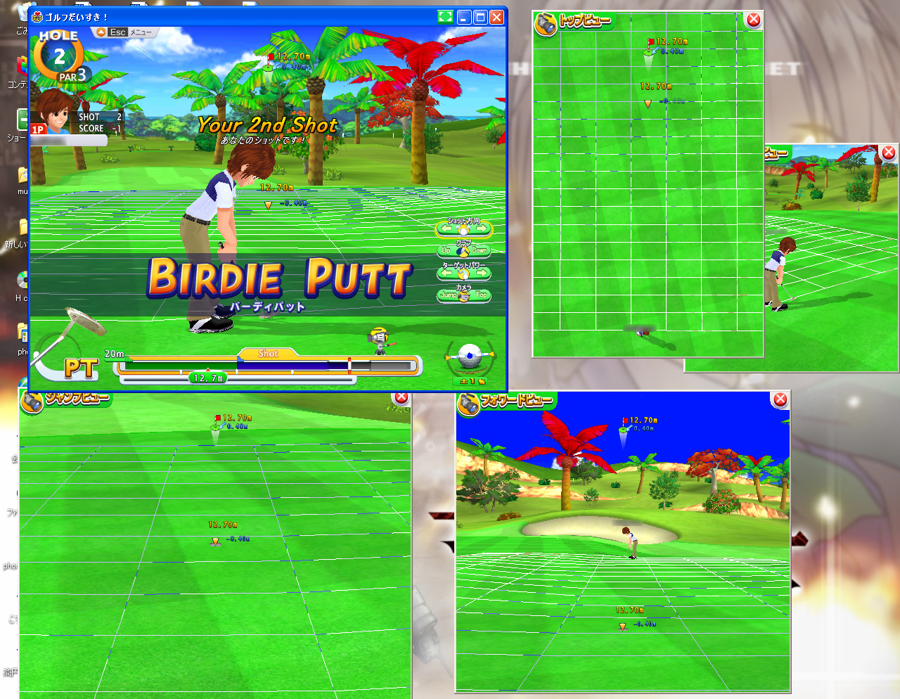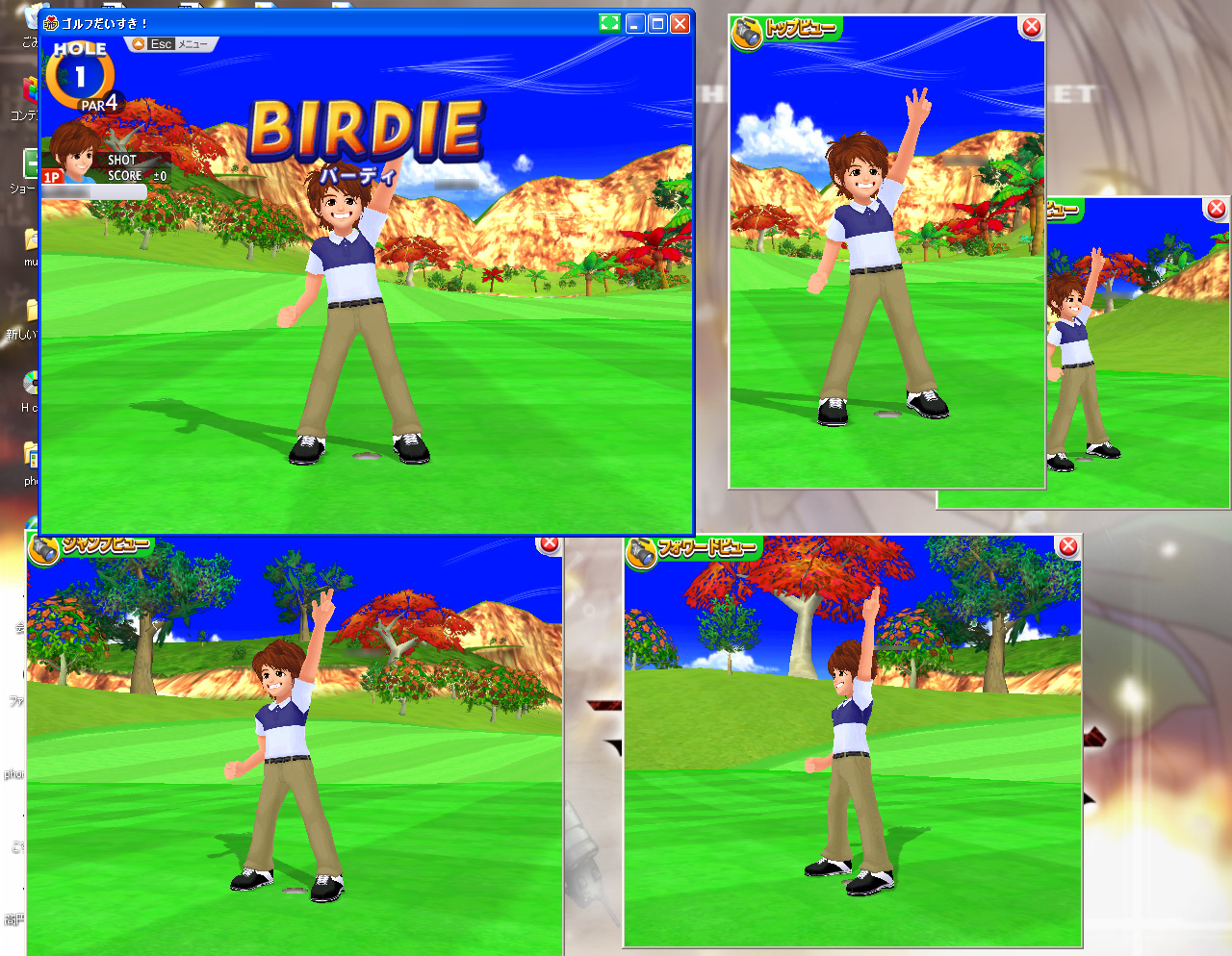 | このマルチウィンドウ,グリーン上ではとくに便利。ラインなどが読みやすいのだ | テレビのゴルフ中継でもこんなマルチアングルは見たことない。PCゲームならではの機能といえる | バーディを取って喜ぶ姿もマルチウィンドウで表示。そない喜ばんでもよかろうに |