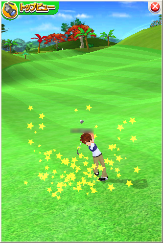 | 現在ではゴルフゲームの定番となった派手なエフェクトは,本作でも採り入れられている | 強風が吹いている場合は,このように風がクルクルと回るエフェクトがあって分かりやすい | ショット後にボールが落下する地点をあらかじめ矢印で示してくれる |