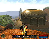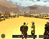 | プレイヤーの射た矢がちゃんと刺さっている。細かい点だが,リアリティの面で重要なポイントだ | なにやら怪しげな神殿を発見。砂漠地帯には巨大な神殿や寺院が多く存在する。そのほかの建造物もユニークだ | ノマド達の信頼を得て,共にハシシンの町を襲撃する。ハシシンはオークどもと密接な関係があるのだ |