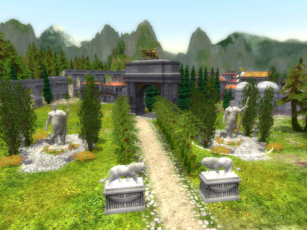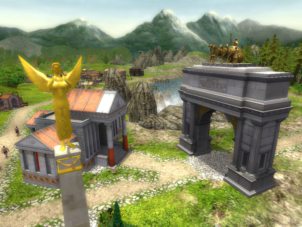 | 凱旋門や黄金の像といった記念碑は,一定の発展度を達成すると建設が許可される。記念碑の近くの住居は,名声が高まって階級が上がりやすいという利点がある |