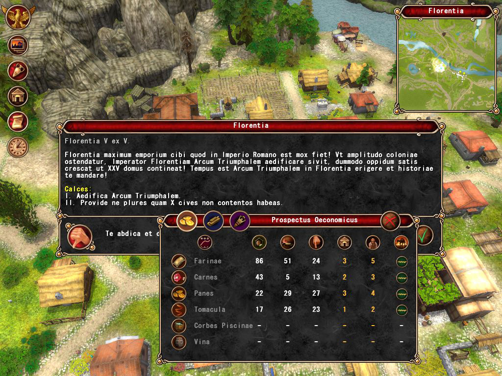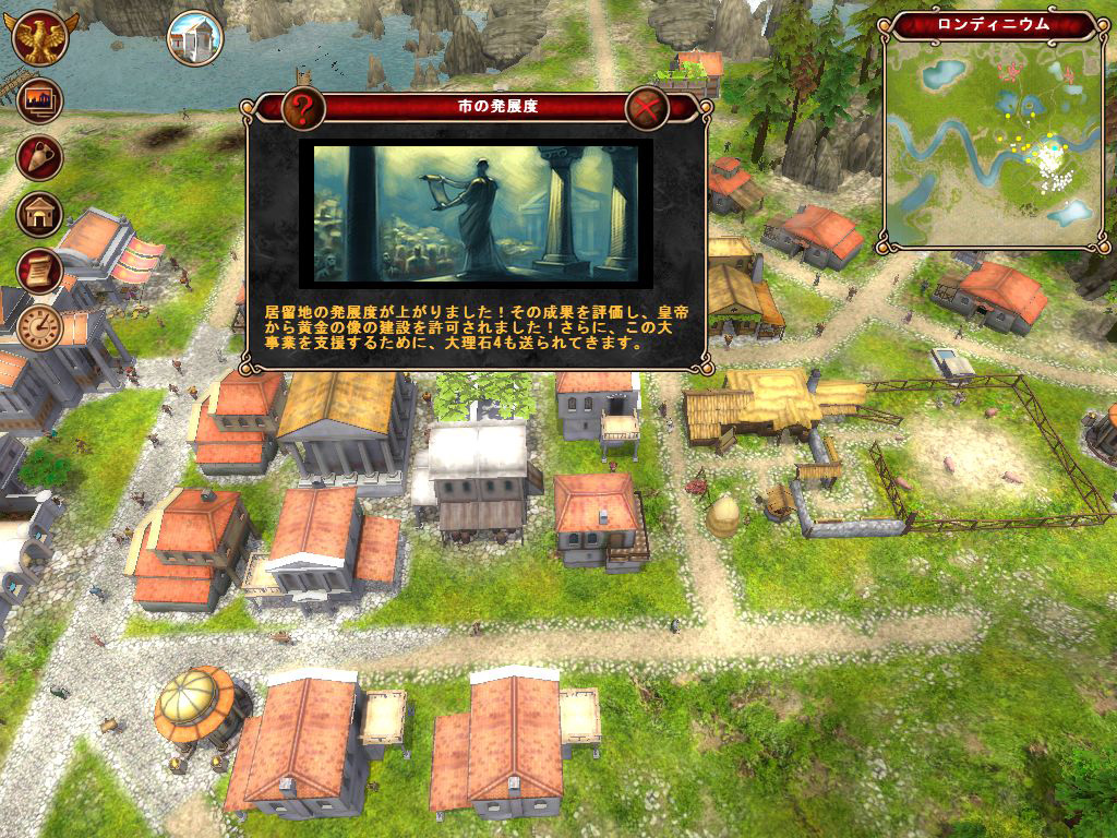 都市には段階ごとに発展度(町の公会堂をクリックすると表示される)が設定されていて,その発展度がアップするごとに,ローマ皇帝から新たな記念碑の建設許可が下りる。凱旋門やコロシアムなど,ローマの華やかさを象徴する建物が多数用意されているので,中盤以降は景観作りの楽しみも十分にある。