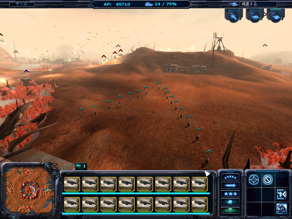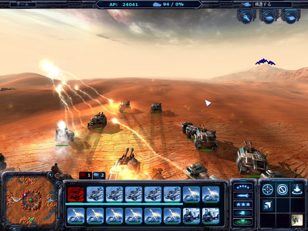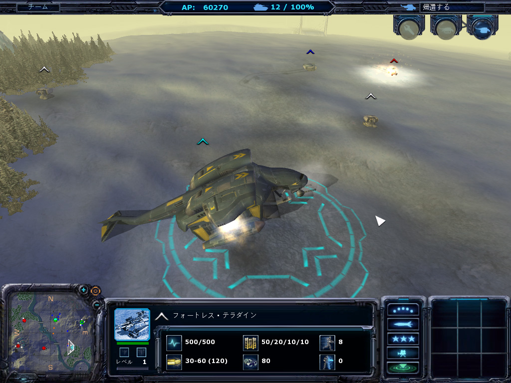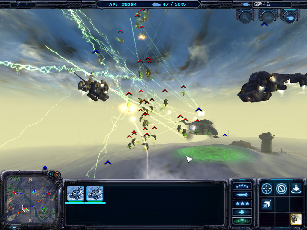 | ユニットの増援はすべてこのドロップシップを使って行う。ただし,ユニットの増援には「AP」が必要なので,これをいかにして効率よく稼ぐかがポイントだ。APは拠点を制圧するか,敵ユニットを破壊すると獲得できる |