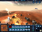 | 敵に遭遇すると自動的に攻撃を行う。誘導ミサイルが発射されると,弧を描きながら敵ユニットに飛んでいく | 背景に描かれた天体も美しいが,ユニットが砂漠を走行しているときに巻き上がる砂ぼこりもまた見事だ | ヴァイロン軍の攻撃シーンは独特の弾道が美しい。だが,倒されると緑色の液体を吹き出すのが何とも不気味 |